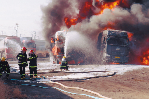 11月16日,鞍山海城東四鎮(zhèn)一大型物流公司停車場,兩輛大貨車與一輛油罐車相撞,導(dǎo)致30噸油罐車裝載的汽油泄漏起火。海城消防調(diào)集人員火速前往撲救處置,經(jīng)一小時(shí)工作,大火被撲滅,現(xiàn)場無人員傷亡。